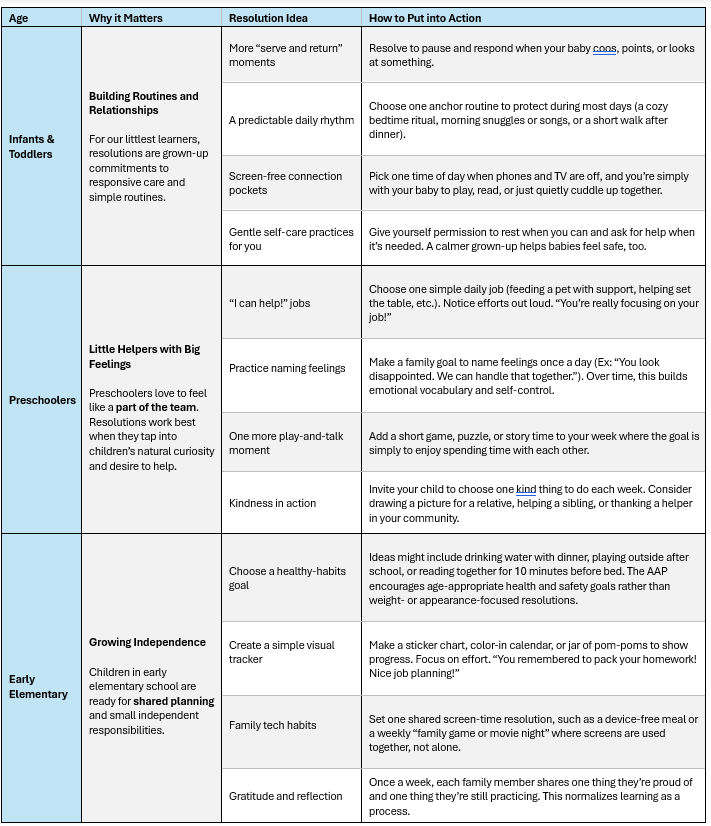 As you enter a new year, remember you don’t have to reinvent your family or your child. You are already supporting their growth with every bedtime story, every patient reminder, and every hug after a hard day. Choosing one small, realistic resolution for each age and stage can simply shine a light on what you’re already doing well. It can also create a fun, hopeful way to keep learning as you grow together.